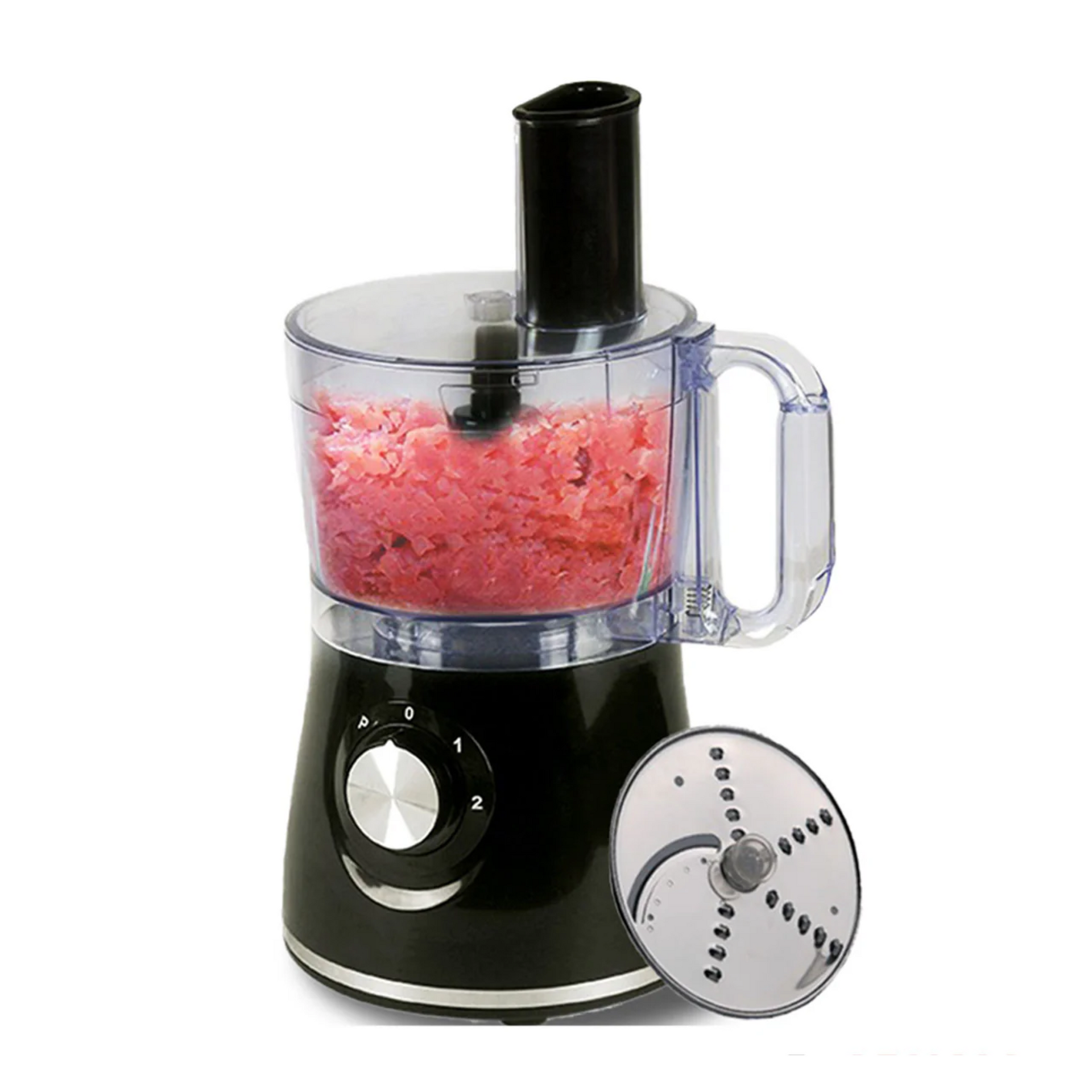 2 speed with pulse.Copper motor with thermostat.1.2 liter plastic processing bowl .Stainless steel chopper blade.Plastic dough blade.Stainless steel disc for slicing and shredding.